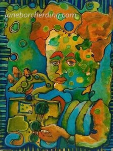 “The Musician” acrylic on paper, 6″ x 8″, 2019