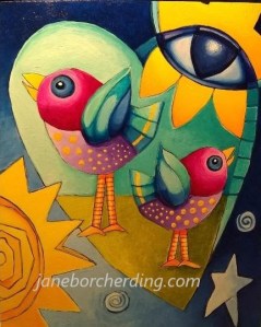“Three Birds in a Heart Singing” acrylic on panel, 8″ x 10″, 2019